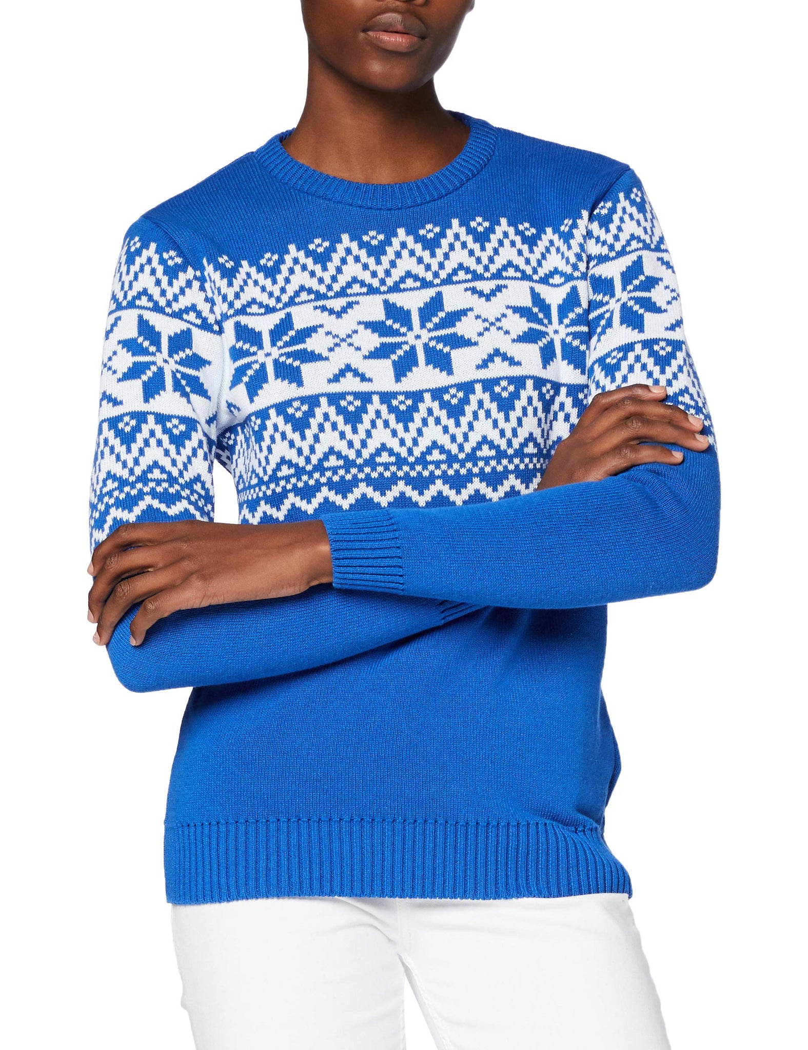 Our royal blue crew neck Nordic fairisle jumper is a cool take on a Christmas classic! Easy to wear, this bold geometric snowflake design is guaranteed to never go out of style. Knitted in the UK from our supersoft 100% recycled yarn.